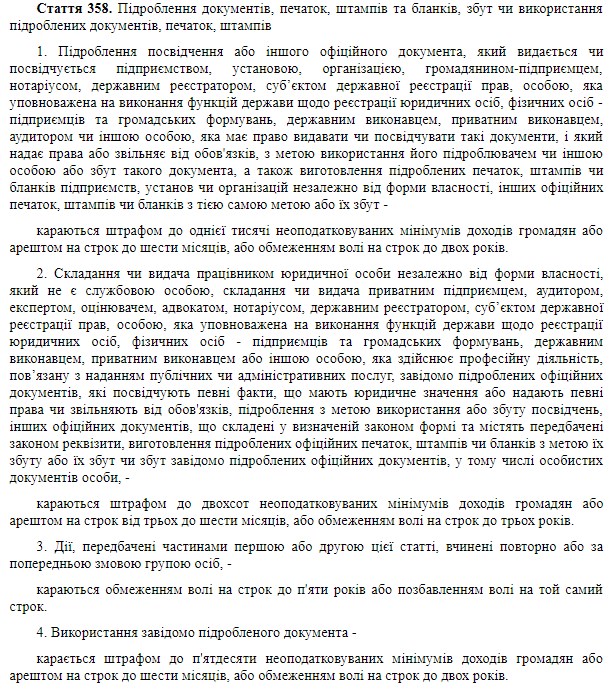 А все тому, що стаття 358 Кримінального кодексу визначає, що злочин вважається вчиненим у разі: