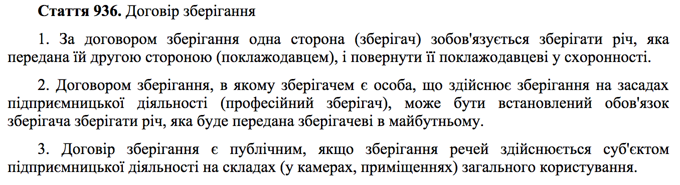 З огляду на українське законодавство, тут усе чітко. Передачу майна на зберігання іншій особі або компанії регулює Цивільний кодекс України. Беручи ваші речі на зберігання, компанія, що пропонує таку послугу, має підписати з вами письмовий договір. Так працівники компанії беруть на себе зобов’язання зберігати річ і повернути її вам у схоронності.