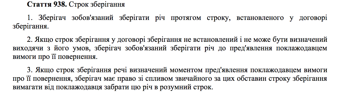 Компанія, яка надає таку послугу, має зберігати річ протягом строку, встановленого в договорі. Якщо строк зберігання не встановлений і не може бути визначений виходячи з його умов, вашу річ мають зберігати до пред’явлення вами вимоги про повернення цієї речі.