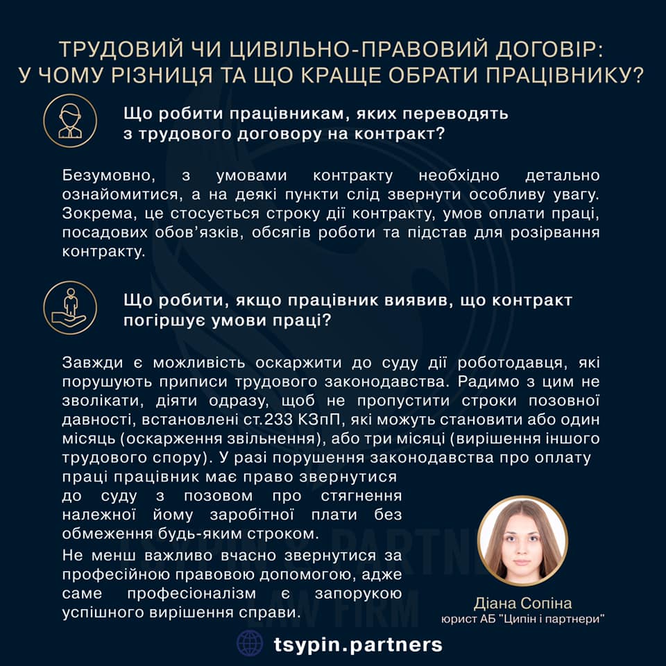 Який варіант роботи краще обрати: за трудовим чи за цивільно-правовим договором? Чи є різниця між трудовим договором і трудовим контрактом? Що робити працівникам, яких переводять з трудового договору на контракт, погіршуючи умови праці?