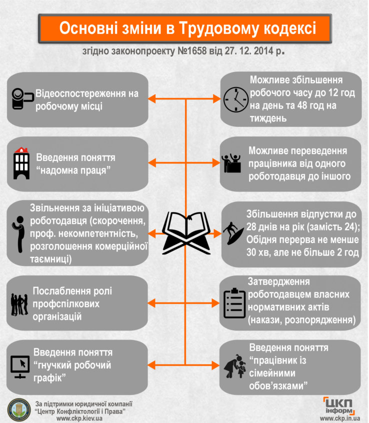 Новий Трудовий кодекс України, у разі його прийняття, набуде чинності з 1 січня 2016 року. Основні нововведення, які чекають працівників та роботодавців із запровадженням оновленого трудового законодавства схематично висвітлено у даній інфографіці.