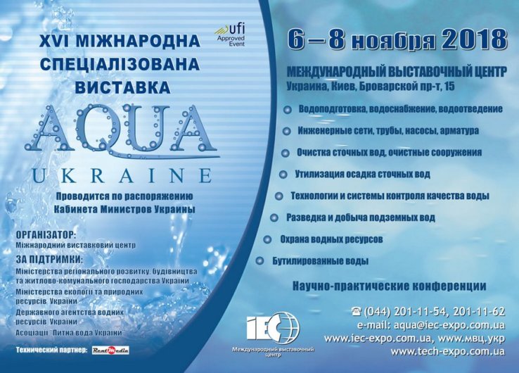 AQUA UKRAINE – це схвалений UFI і вже традиційний щорічний Міжнародний водний форум, який проводиться за розпорядженням Кабінету Міністрів України з метою впровадження світових стандартів і передових досягнень у водному господарстві України