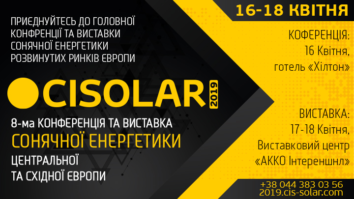 16-18 квітня у Києві відбудеться головна бізнес-подія регіону у сфері сонячної енергетики, присвячена новітнім технологіям, трендам та інвестиційним можливостям – CISOLAR 2019, 8-ма Міжнародна Конференція та Виставка Сонячної Енергетики в Центральній та Східній Європі