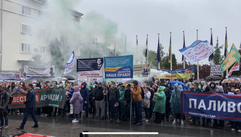 На мітинг вийшли довірителі банку “Аркада”, інвестори трьох житлових комплексів — ЖК “Еврика”, ЖК “Патріотика” і ЖК “Патріотика на озерах”. Інвестори банку кілька років чекають на завершення будівництва квартир, за які вже заплатили 100% вартості або продовжують платити кредити