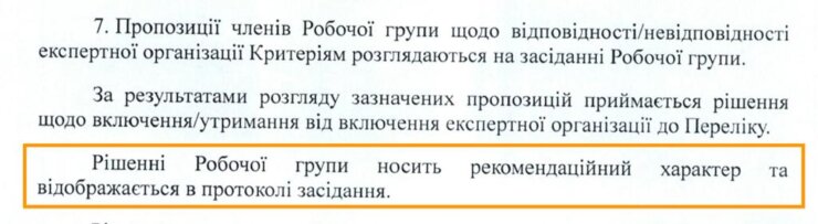 Як виявилося, Робоча група не має повноважень схвалювати або виключати експертні організації з реєстрів. Їхні рішення мають виключно рекомендаційний характер. Але по факту рішення ухвалюють саме вони.