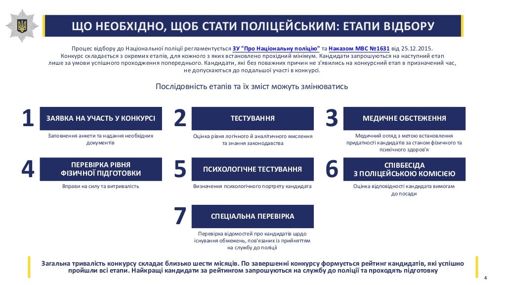 Базовими вимогами до допущення у конкурсі на посаду є українське громадянство, вік від 18 до 55 років, наявність повної середньої освіти та виконання умов, передбачених законами “Про очищення влади” та “Про національну поліцію”.