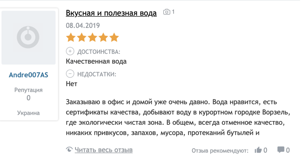 Постійні клієнти цього сервісу відмічають, що основна його перевага – це завжди якісна та смачна вода, яку добувають в екологічно чистій зоні – курортному містечку Ворзель. Вода не має ніяких сторонніх запахів та не залишає накипу на посуді.