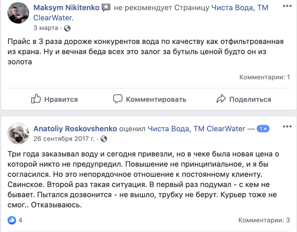 Та крім суттєвих переваг компанія має і свої недоліки. Так, клієнти Clear Water з року в рік скаржаться, що трапляються випадки, коли ціна на воду змінюється без попередження.