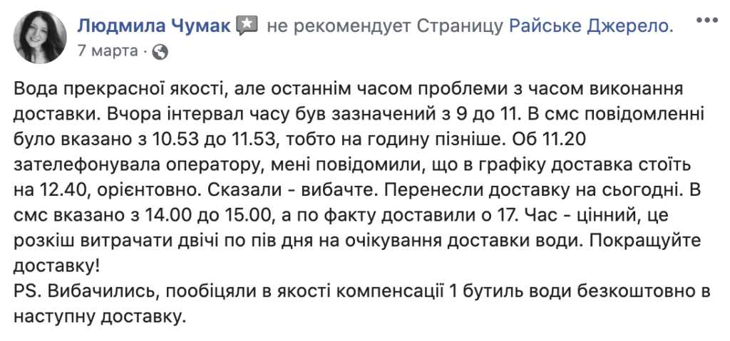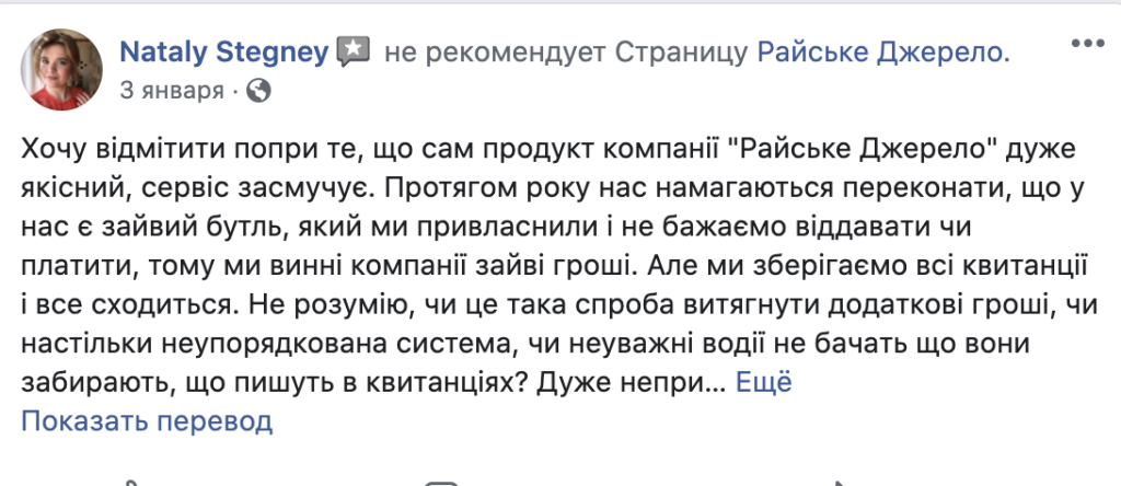 Що стосується недоліків, то, як і в багатьох інших сервісів з доставки води, на жаль, слабким місцем компанії “Райське джерело” клієнти називають рівень обслуговування.