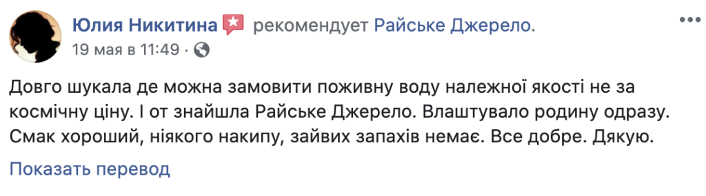 Ще одна компанія, яка пропонує якісну питну воду за порівняно низькою ціною. Користувачі відмічають, що вода “Райське джерело” смачна, без сторонніх запахів та не залишає накипу на посуді.