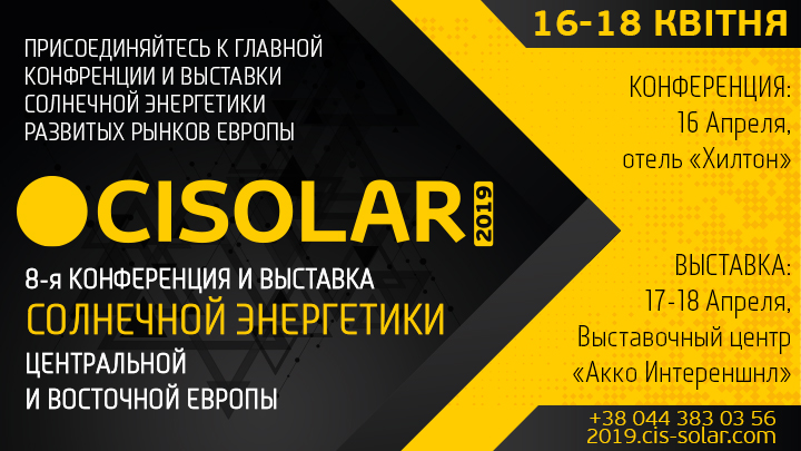 16-18 апреля в Киеве состоится главное бизнес-событие региона в сфере солнечной энергетики, которое посвящено новейшим технологиям, трендам и инвестиционным возможностям – CISOLAR 2019, 8-я Международная Конференция и Выставка Солнечной Энергетики в Центральной и Восточной Европе.