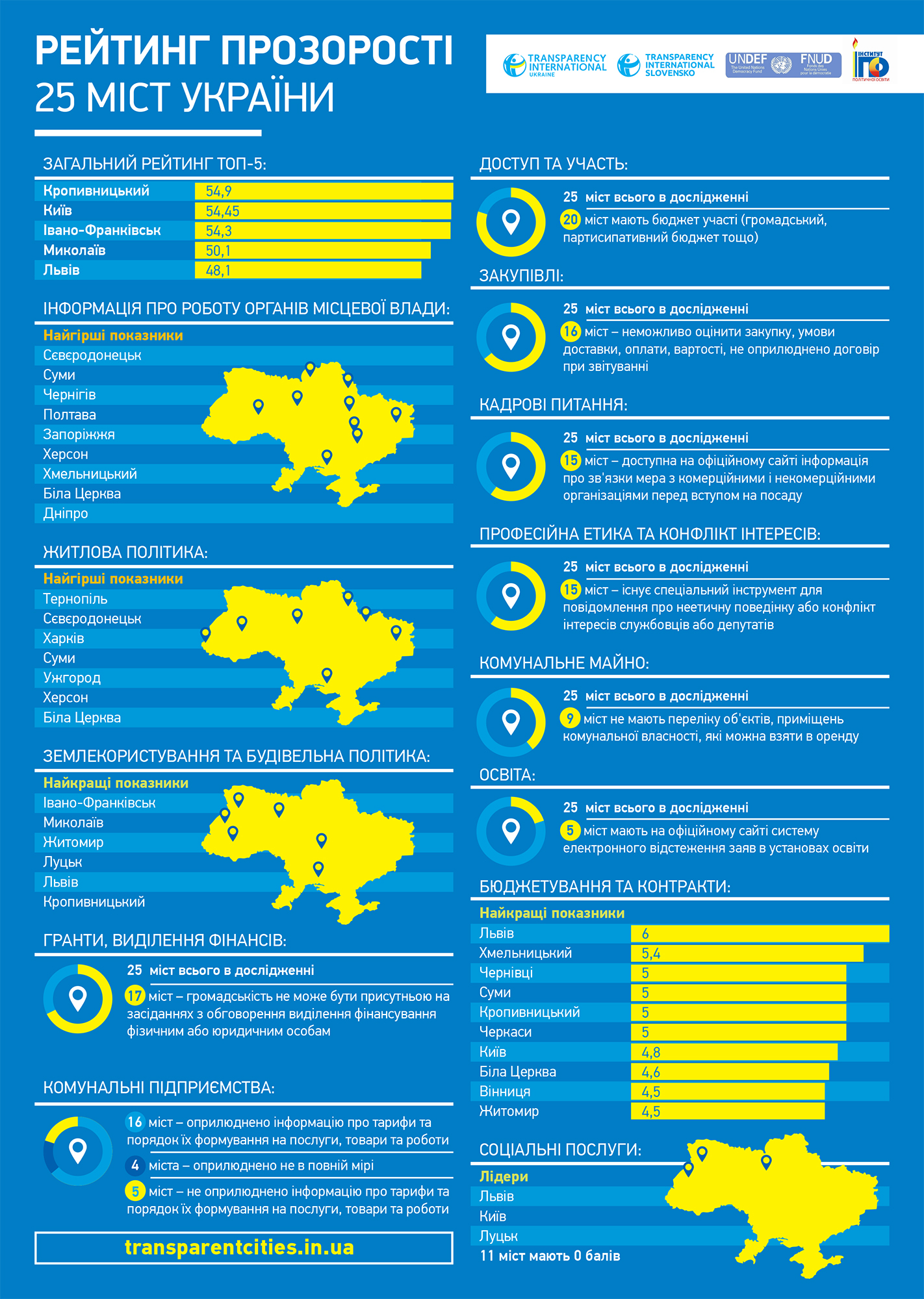 Согласно данным пилотного анализа прозрачности и открытости городов, Кропивницкий получил 54,9 балла из 100, Киев – 54,45, Ивано-Франковск – 54,3. В пятерку лидеров также вошли Николаев – 50,1, Львов – 48,1.